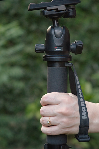 Some monopods have a small ribbon attached at the top end. By inserting the hand through this, the ribbon essentially safeguards the monopod from falling. On letting the hand rest on it while holding the monopod tends to provide further stability (see the photograph above). There’s no need to press on it further. Doing so will just tire out your hand.