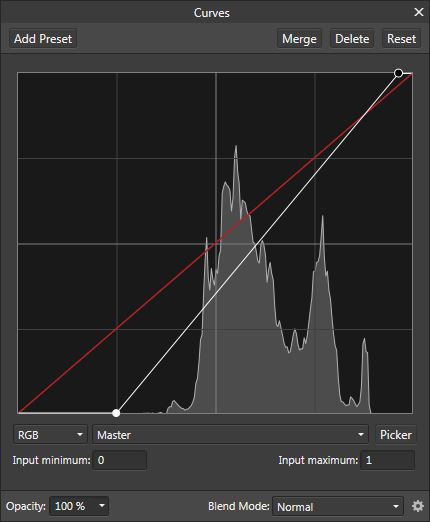 (The histogram as seen in the curves tool, of a usual foggy landscape, predominantly limited to the central part of the available dynamic range. A similar histogram will be seen on the preview screen of the camera too. This is from Affinity Photo since I wrote this article after transferring the photographs to my computer.)