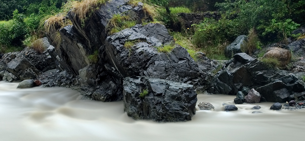 A rainy Sunday morning. Four of us gathered up early in the morning for a planned photowalk. Yesterday evening, we had thought of going for an early morning outing. Rain or no-rain, the photowalk was still ‘on’. We were not going to let a few drops downpour spoil our plans. Packed with our photography gear and umbrellas, we all started off for our destination while the day was still breaking out. With an overcast sky, the photography was going to be nice, provided the rains stopped a little. The destination? A mountain stream that should be nicely flooded at this time of the year.
