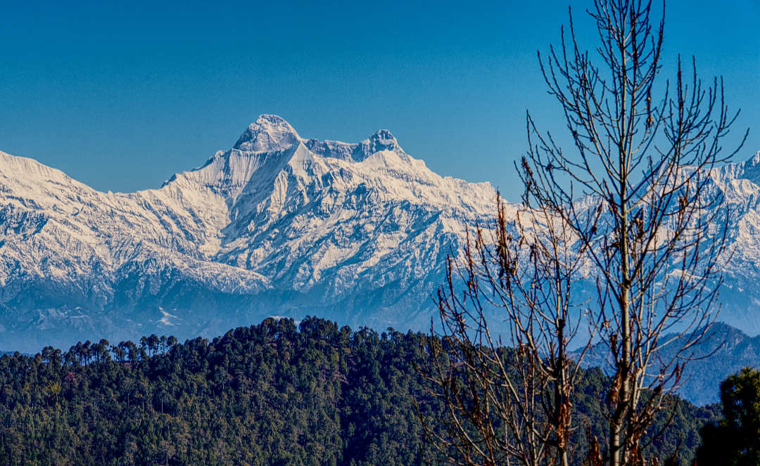 (Nanda Devi peak. This was what I could capture with my average quality lens. The vignetting and lack of micro-contrast are obvious to any trained eye. I had to go overboard with sharpening to make the image useful here. )
