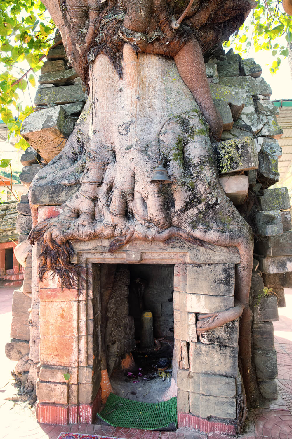 Directly opposite the main temple stands another beautiful Shiva temple, on top of which a tall peepal tree grows. The temple appears on the verge of collapse, as if it is being gently held together by the embracing roots of the ancient tree.